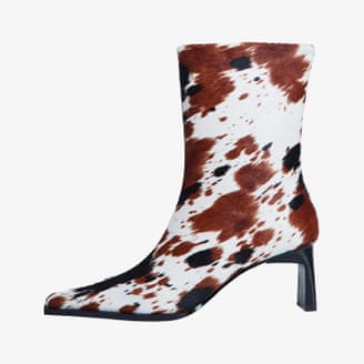 These cowprint boots will add textural interest to any outfit. With a sculptural, slim square heel, these ankle-cut boots are easy to wear, poking out of jeans or with a dress.